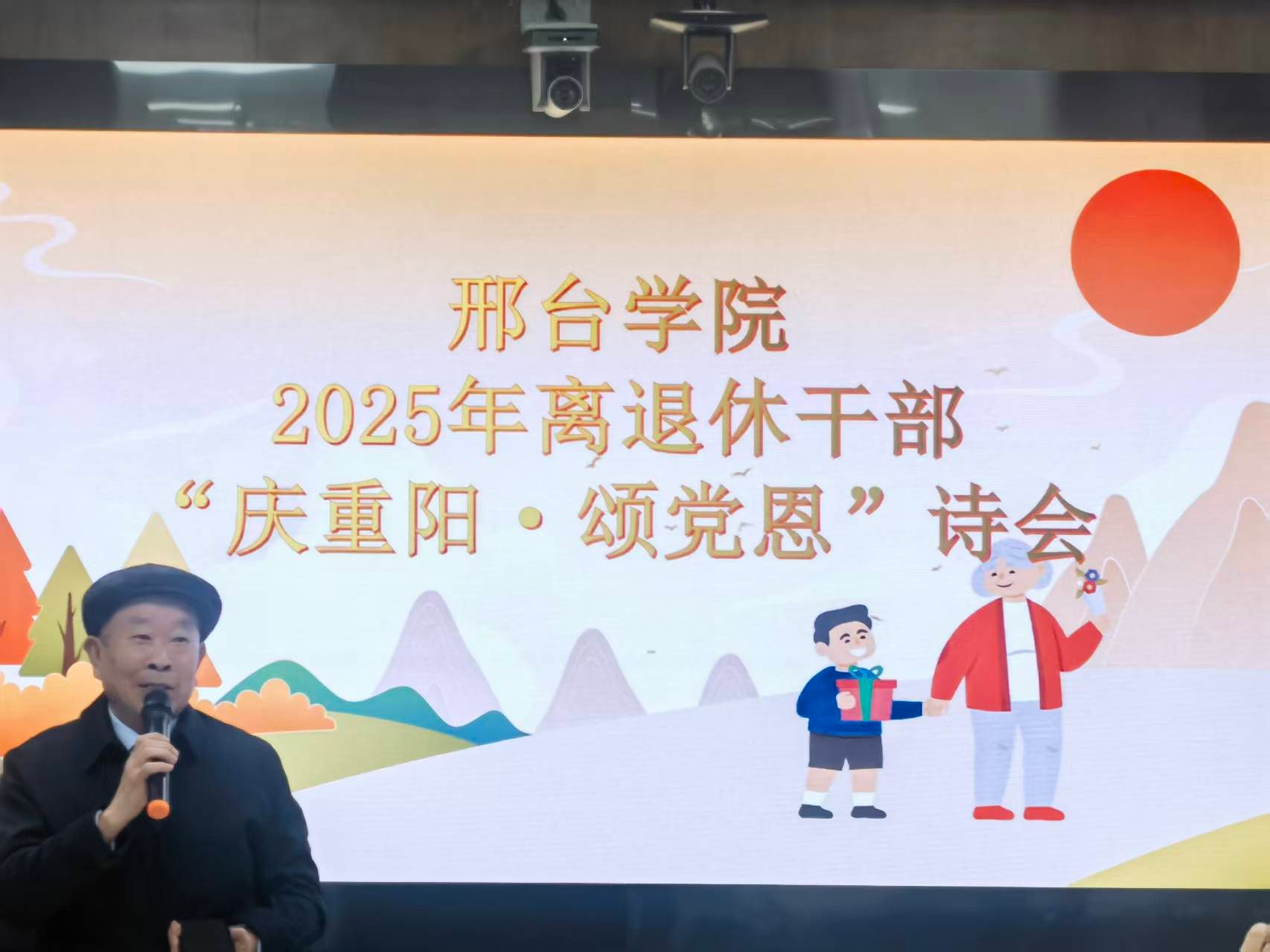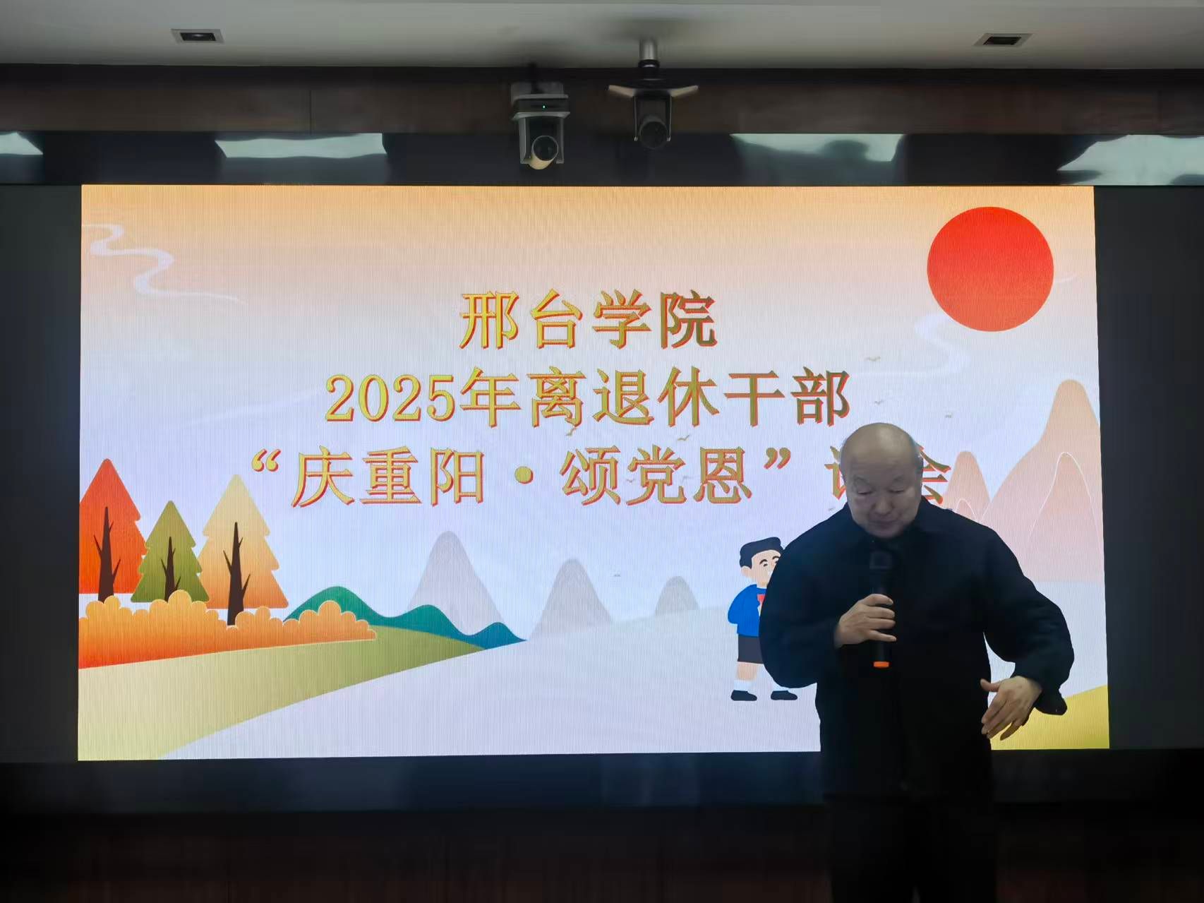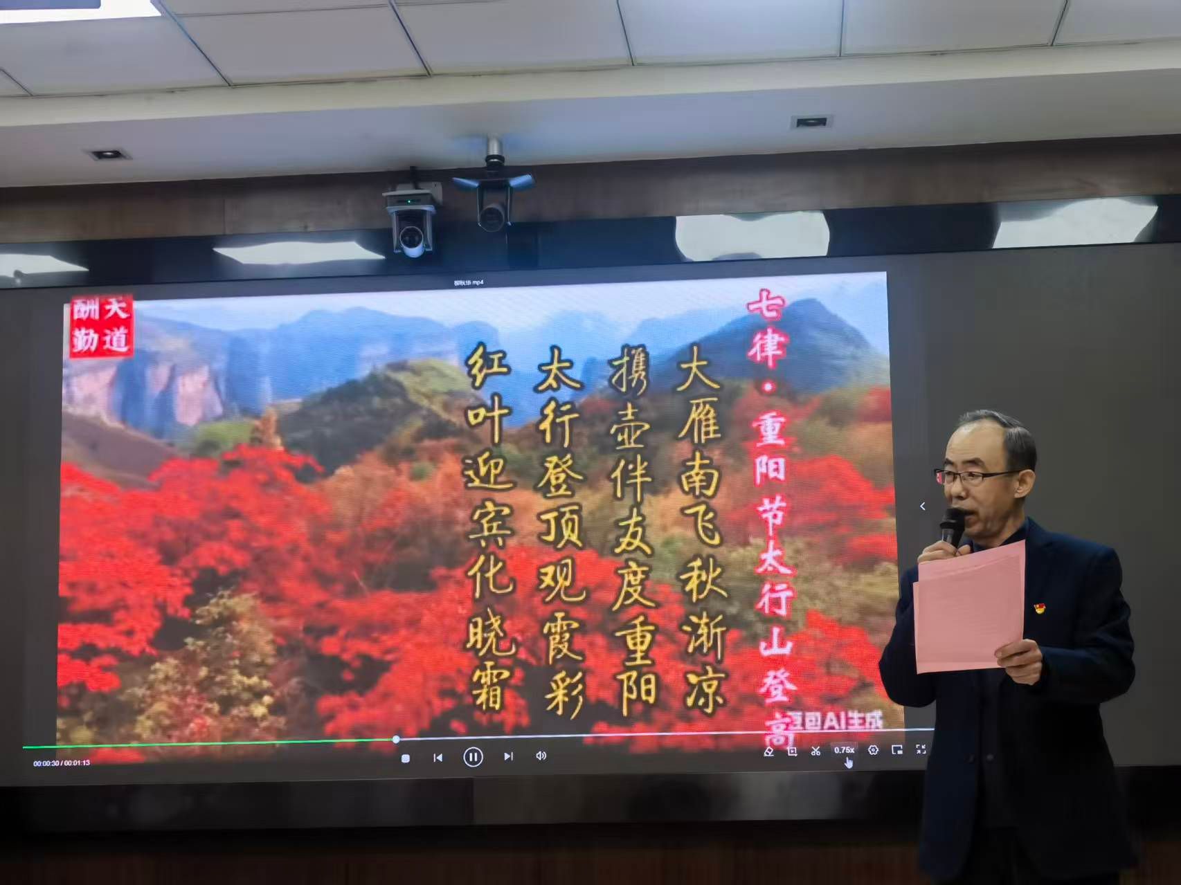 “庆重阳、颂党恩”诗文朗诵由离退休第四党支部书记柳秋华主持。柳秋华同志退休后担任邢台市诗词协会副会长,他笔耕不辍,不断拓展创作领域,作品颇丰,常见于诗刊、报纸,多个作品获得省、市奖项。李瑞国、李如祥、柳秋华、潘振荣、张锦川、张胜林等老同志们的朗诵饱含深情,或抒发对生活的热爱,或歌颂党的伟大,或期盼学校发展越来越好,或描绘民族复兴的伟大蓝图,充分展现了我校广大离退休同志爱党爱国、积极乐观的精神风貌。