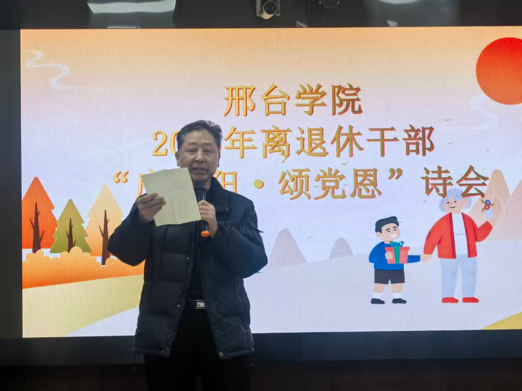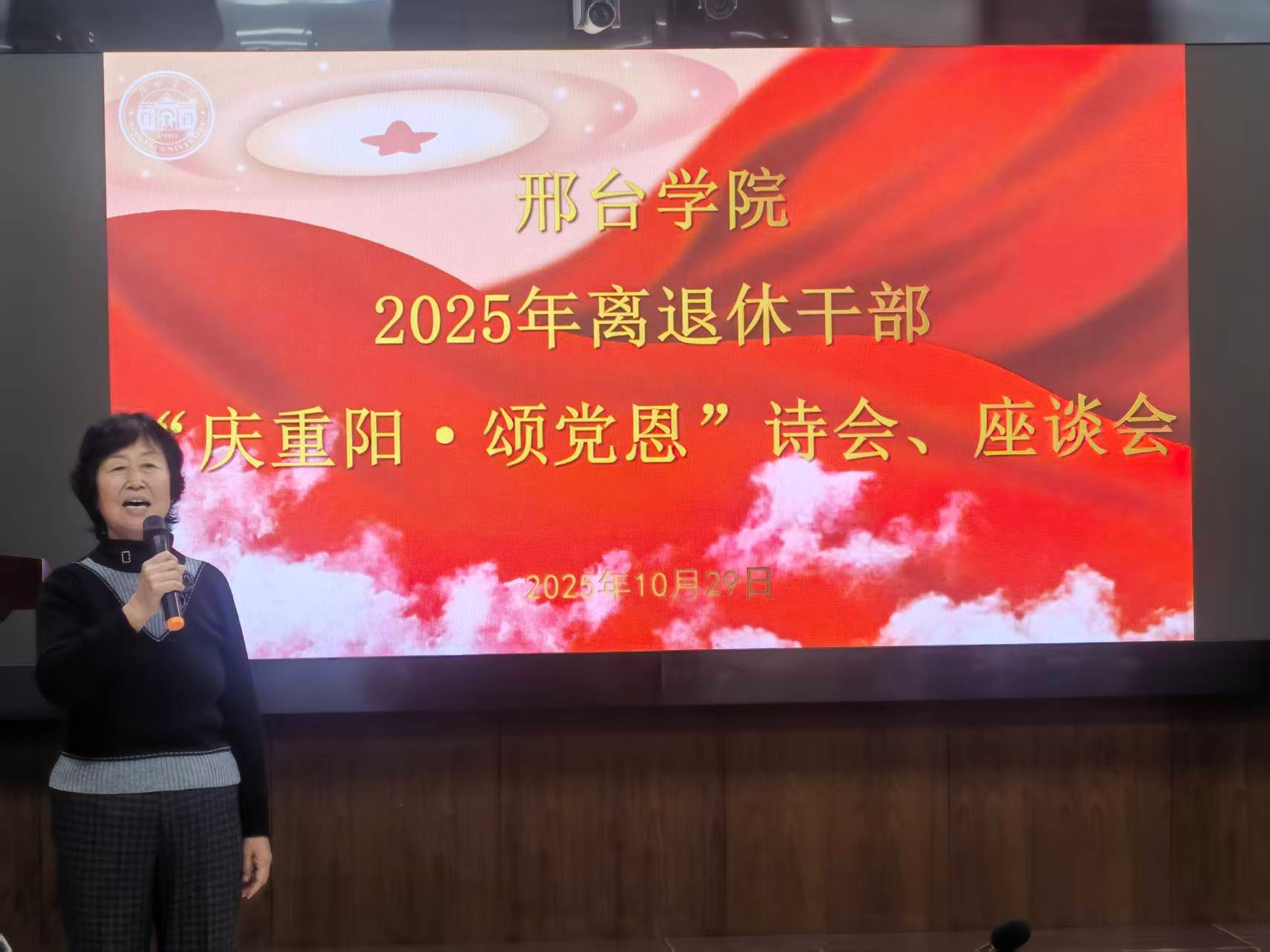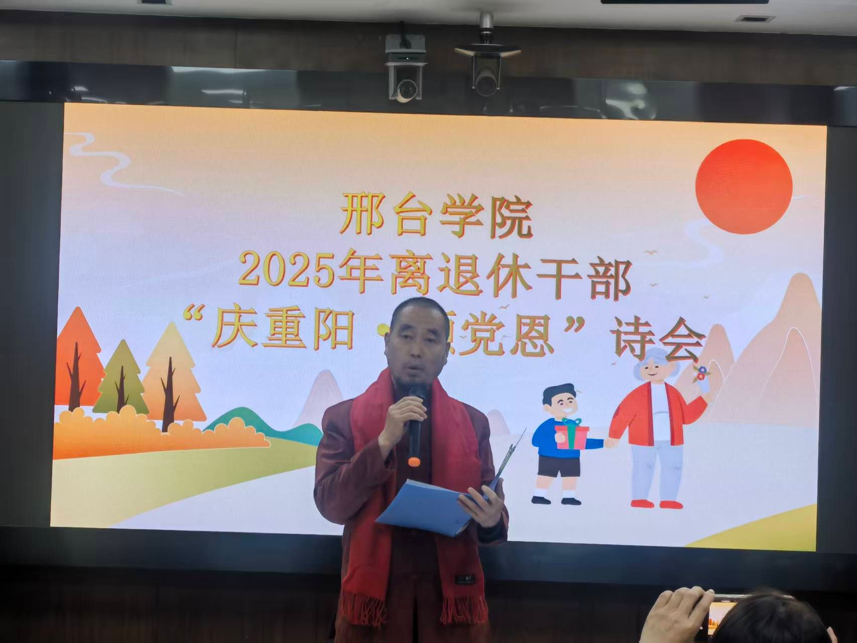 “庆重阳、颂党恩”诗文朗诵由离退休第四党支部书记柳秋华主持。柳秋华同志退休后担任邢台市诗词协会副会长,他笔耕不辍,不断拓展创作领域,作品颇丰,常见于诗刊、报纸,多个作品获得省、市奖项。李瑞国、李如祥、柳秋华、潘振荣、张锦川、张胜林等老同志们的朗诵饱含深情,或抒发对生活的热爱,或歌颂党的伟大,或期盼学校发展越来越好,或描绘民族复兴的伟大蓝图,充分展现了我校广大离退休同志爱党爱国、积极乐观的精神风貌。