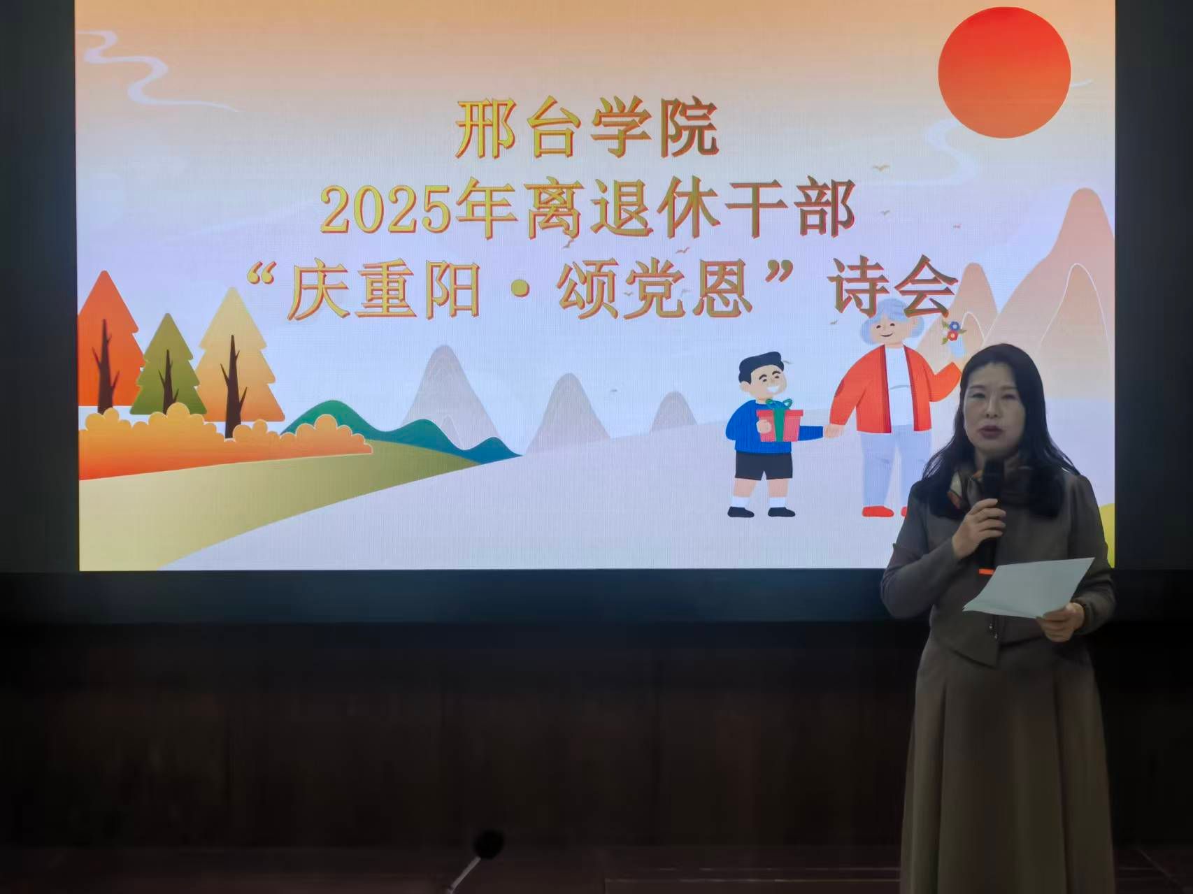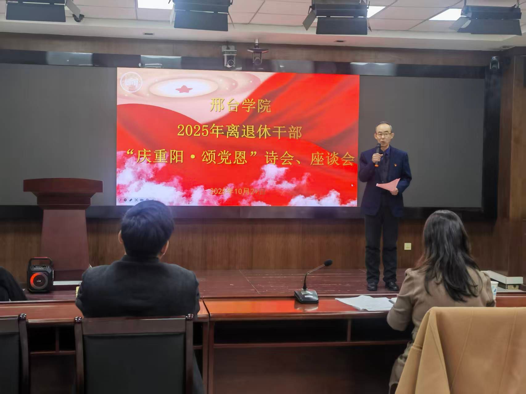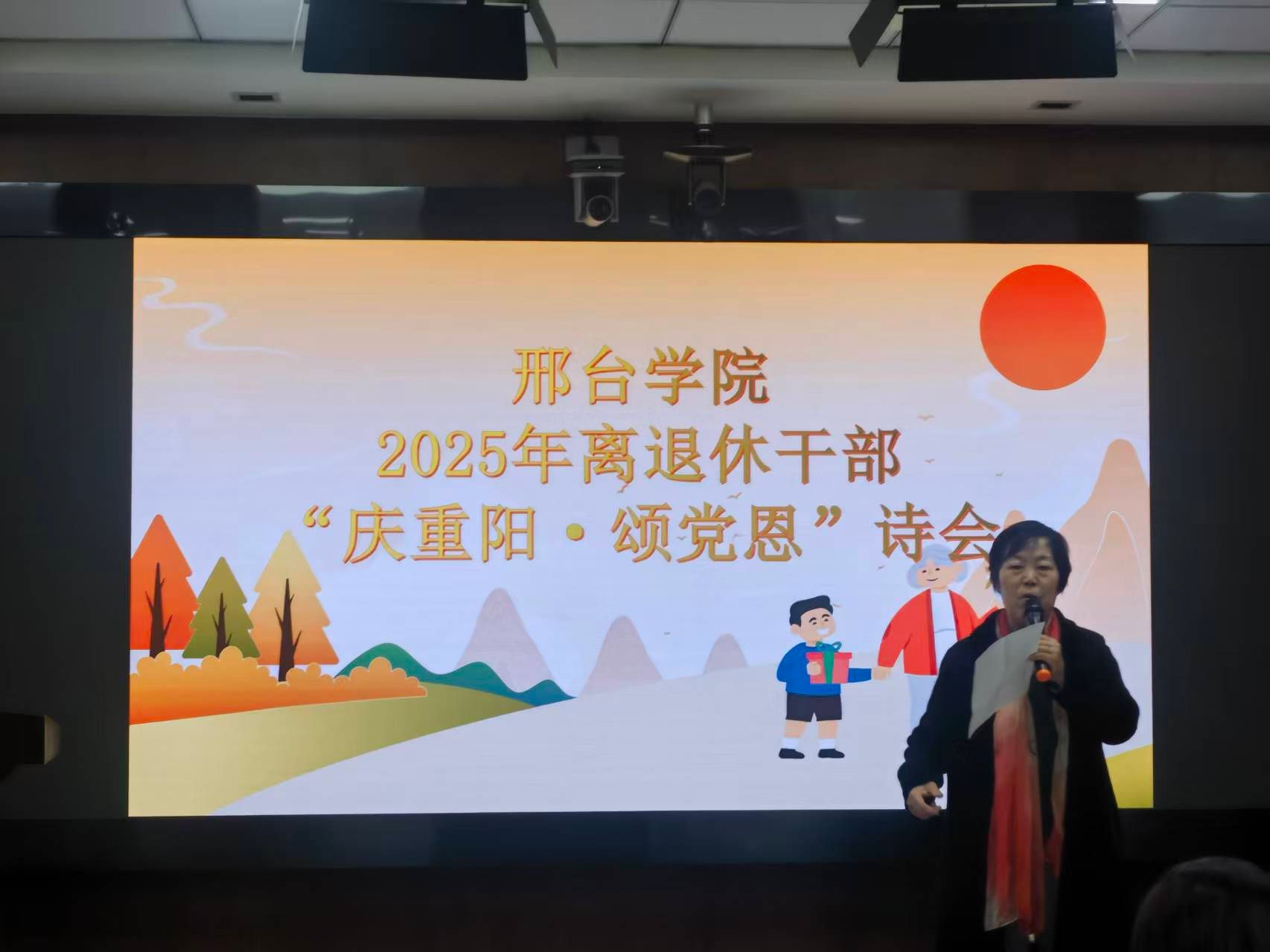 “庆重阳、颂党恩”诗文朗诵由离退休第四党支部书记柳秋华主持。柳秋华同志退休后担任邢台市诗词协会副会长,他笔耕不辍,不断拓展创作领域,作品颇丰,常见于诗刊、报纸,多个作品获得省、市奖项。李瑞国、李如祥、柳秋华、潘振荣、张锦川、张胜林等老同志们的朗诵饱含深情,或抒发对生活的热爱,或歌颂党的伟大,或期盼学校发展越来越好,或描绘民族复兴的伟大蓝图,充分展现了我校广大离退休同志爱党爱国、积极乐观的精神风貌。